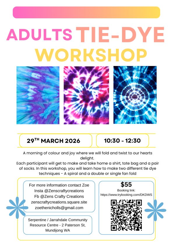 Ready to add a splash of colour to your March? Come and twist, fold and create something uniquely YOU at our upcoming Tie-Dye Workshop!